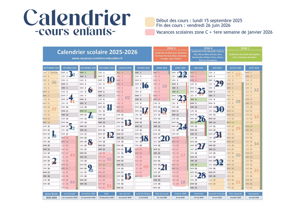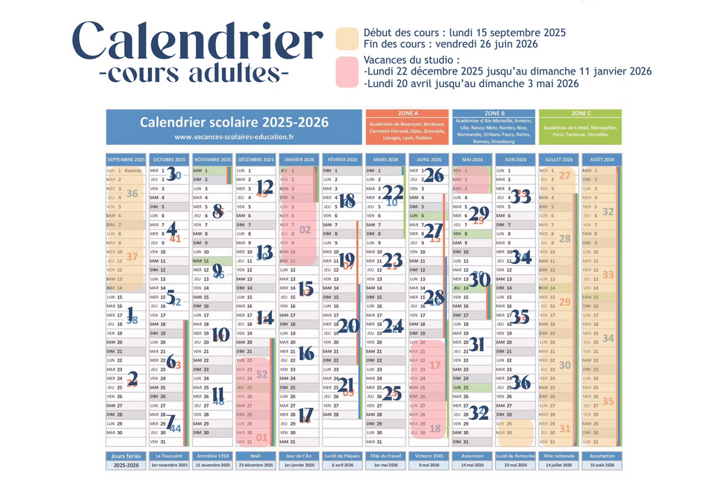 Les cours à l’année commencent la semaine du 15 septembre 2025 et se finissent la dernière semaine de juin 2026.